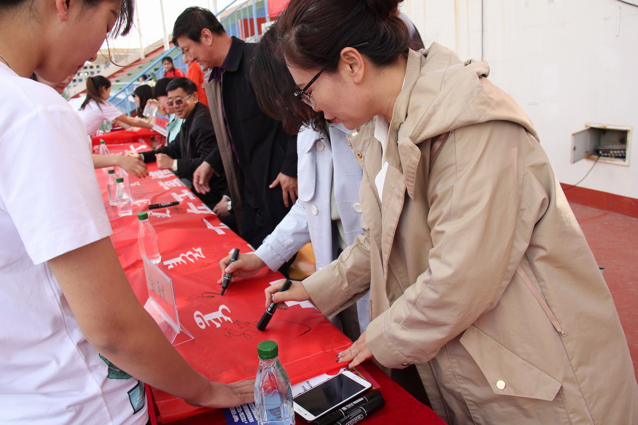 师生共同在心理健康宣传横幅上签名