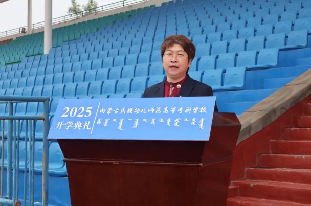 党委副书记、校长李春晖致辞,她向怀揣梦想、跨越山海而来的新同学表示热烈的欢迎,她用七个“首次”与大家分享了学校在这一年以来的收获与成果,内民幼师专首次获批人工智能技术应用、营养配餐、现代家政服务与管理、展示艺术设计、网络营销与直播电商5个新专业;新生报到人数首次突破2000人,并迎来了燕赵大地的河北学子;首次入选职业教育国家在线精品课程;首次在“孔雀杯”全国高等艺术院校声乐展演上斩获“两金一银一铜”,四项大奖如四只孔雀飞入民幼师百姓家;首次在世界级职业院校技能大赛中勇夺金奖;首次与浪潮集团、北京金科职桥共建产业学院;首次当选全国学龄前儿童融合教育产教融合共同体副理事长单位和全国融合美育行业产教融合共同体轮值理事长单位。她向开启人生新篇章的同学,送去暖心的勉励,鼓励大家要做一名“敢爱”的民幼人,希望“爱”成为同学们的主色调和主旋律。
