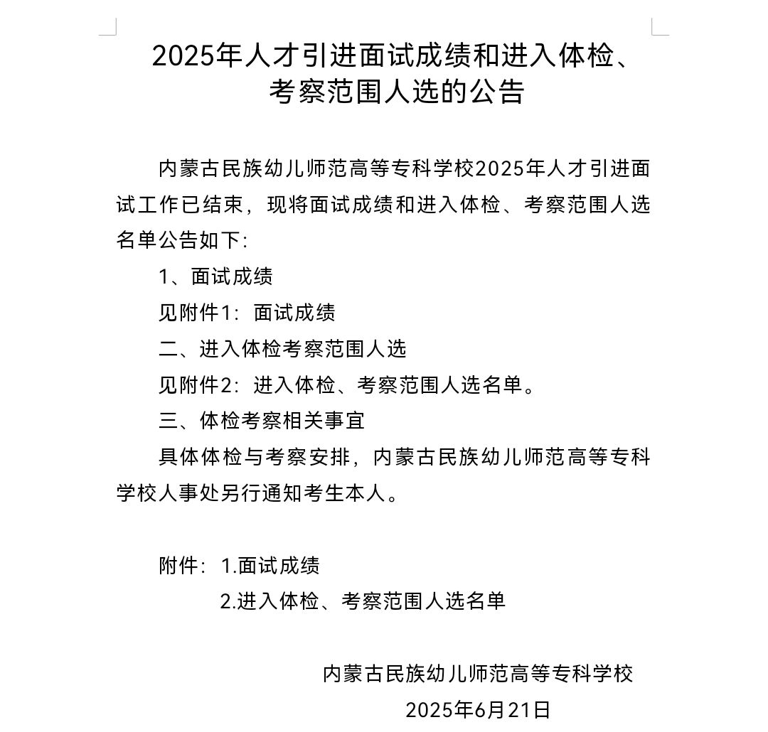 2025年人才引进面试成绩和进入体检、考察范围人选的公告