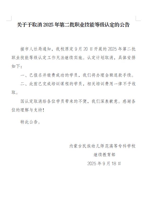 关于于取消2025年第二批职业技能等级认定的公告