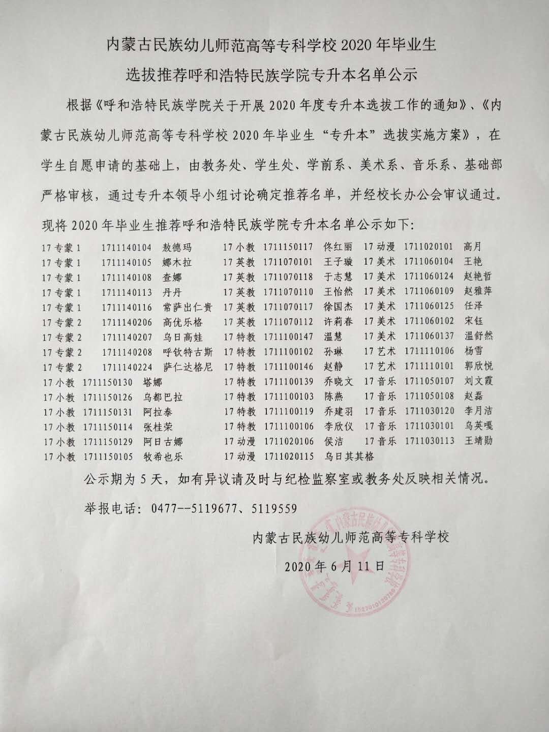 2020届毕业生选拔推荐呼和浩特民族学院专升本名单公示