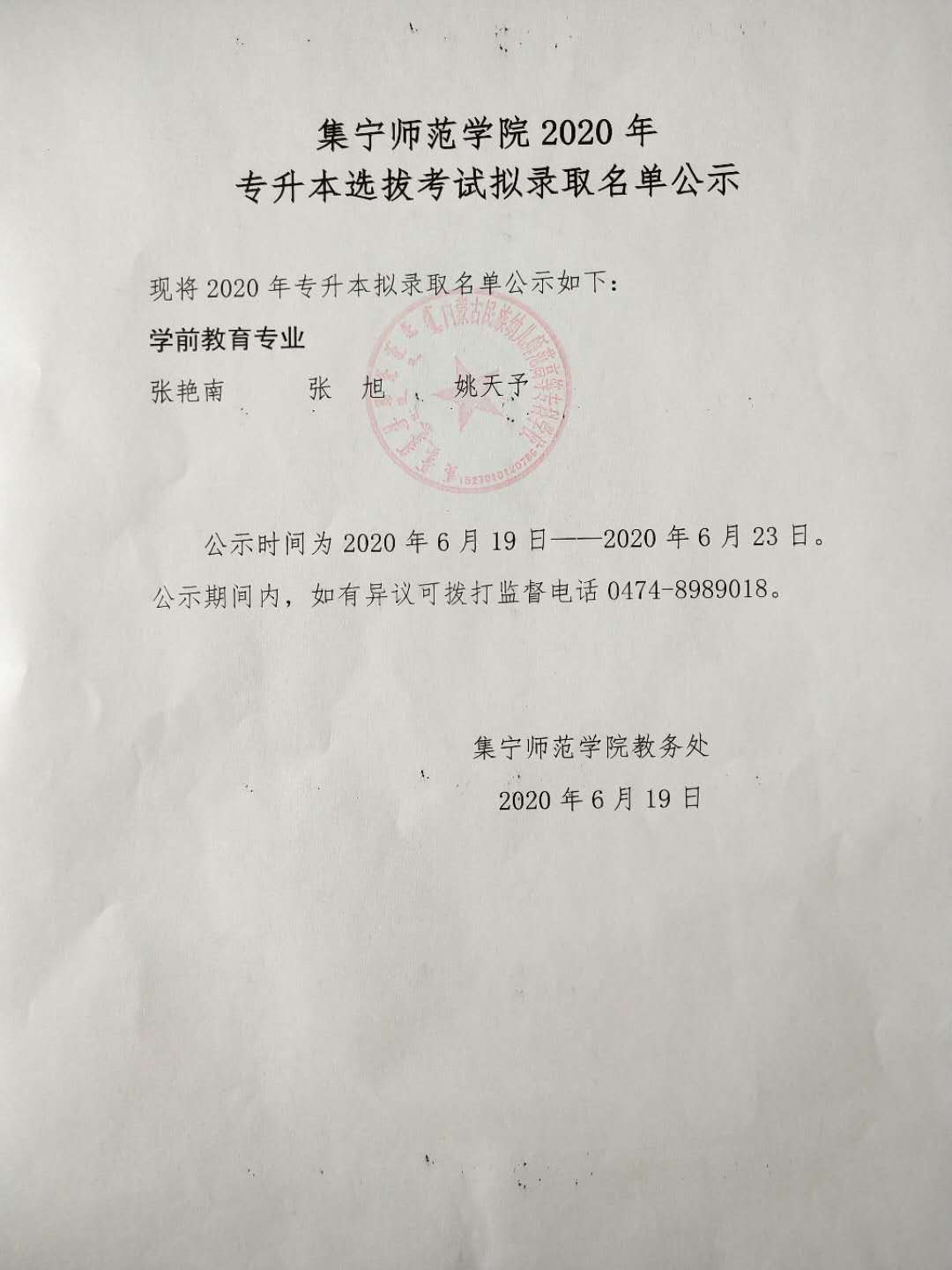 2020届毕业生选拔推荐内蒙古师范大学专升本名单公示
