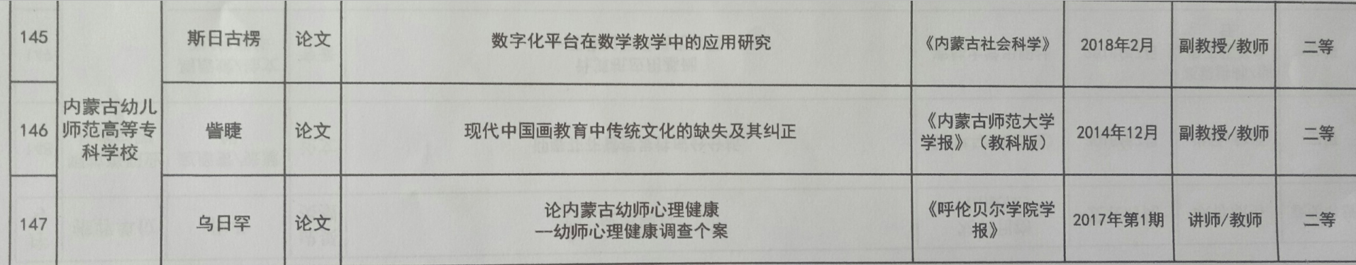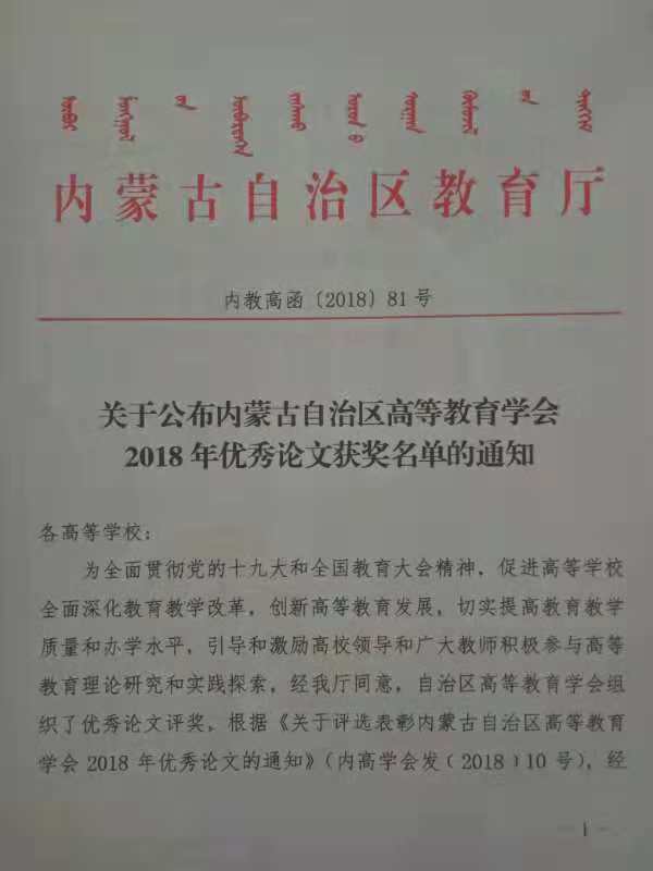 (本网2018年12月12日讯)内蒙古高等教育学会2018年优秀论文获奖名单文件(纸质)已公布,Beat365斯日古楞、訾睫和乌日罕三位老师的科研成果分别获得二等奖,今年已是Beat365参加内蒙古高教学会科研成果评比第四年。