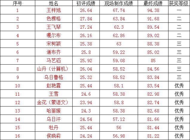 赛后,评审小组根据评分细则,从题目特点、内容呈现、技术运用、整体风格、色彩搭配、层次布局、交互性等方面进行了综合评分。最终,美术系王梓旭老师获得了一等奖,美术系色楞格、公共基础部嘎尔布、学前教育系王飞琴老师获得了二等奖,宋柯颖、道布齐等5名教师获得了三等奖,赵艳霞、王雪等7名教师获优秀奖。