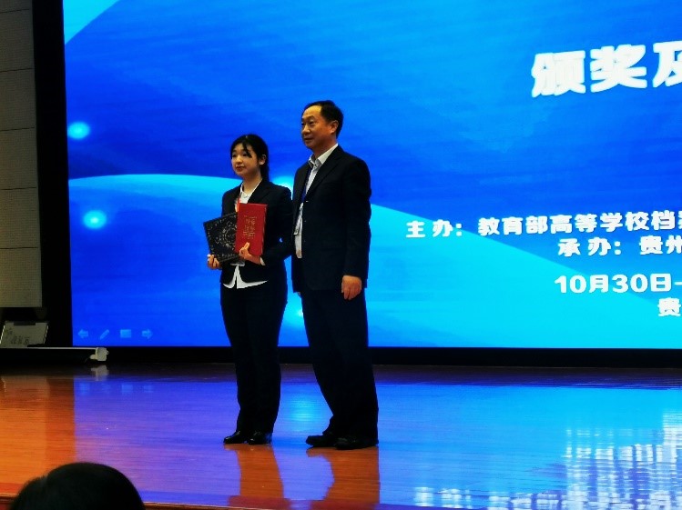 图为档案学教指委主任委员张斌教授为获奖代表冯天予同学颁奖