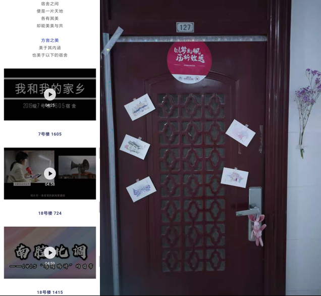 废物利用大赛则锻炼了同学们动手和创新能力,让环保理念在同学们心中生根发芽。9号楼133宿舍利用滴胶的手法让核桃壳成为了小巧的锦鲤游池;8号楼1519宿舍的废口罩手袋手工让口罩得到了更好的归宿,8号楼905宿舍的快递盒再造三件套为宿舍增添了独特的美感和便利······还有更多同学们的优秀作品为校园环保生活提供了有益借鉴。此外7号楼1605以节目改编、18号楼724以抗疫新闻播报、1415以家乡直播带货的形式进行方言大放送,不仅让同学们大开眼界,领会到东营、上海、香港、潍坊等地的特色文化风俗,也为宿舍文化多样性注入了新的活力。优秀宿舍、文明宿舍的评比活动也促使各宿舍成员团结齐心、携手共进,为宿舍集体荣誉而贡献自己一的份力。此外为将独特的历史文化元素体现在学生宿舍日常的学习生活中,学院还为每个学生宿舍精心设计了“以梦为帆 历行致远”标识的宿舍门贴,以此激励青年学子勤学自励、不负韶华。