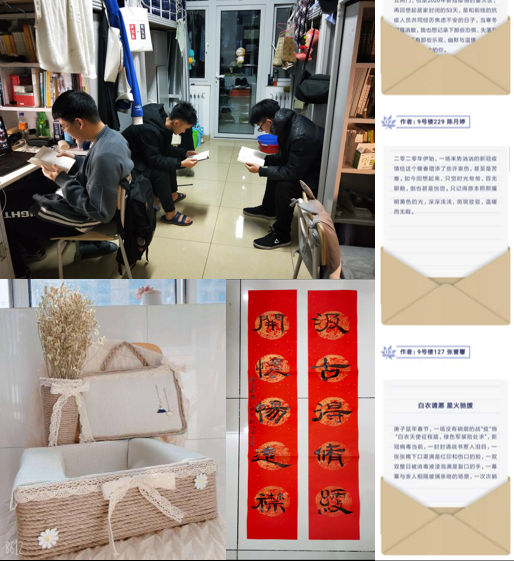 在征文大赛——战疫中的“ta”活动中,18号楼724宿舍的姚丝雨同学以自己亲身经历与心路历程温暖生活,鼓舞人心;9号楼229宿舍陈月婷同学以灯塔为喻,表达了对幸福生活与美好未来的渴望;9号楼127宿舍张誉馨同学聚焦白衣天使,为他们献上赞歌。书画大赛上同学们各展才艺,以精彩的作品表达对艺术和生活的热爱,李明丰同学挥墨纸上,故土的记忆在他的笔下逐渐清晰;张伟霞同学硬笔一曲《鹧鸪天》,别有一番韵味;张沁雨同学对联“汲古得修绠,开怀畅远襟”,尽显历史文化情怀。