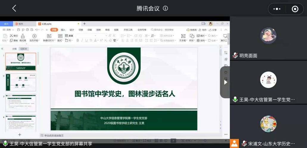 为充分发挥青年大学生党员的理论优势,深入推进党史学习在教育广大师生群体中走深走实,践行“三全育人”理念,多形式、多渠道、多载体加强学习教育,8月10日,历史文化学院“初心如炬”党课宣讲团同中山大学信息管理学院第一学生党支部展开线上联合宣讲活动,由历史文化学院硕士生第二党支部党员杨慧和中山大学信息管理学院第一学生党支部王昊担任主讲。