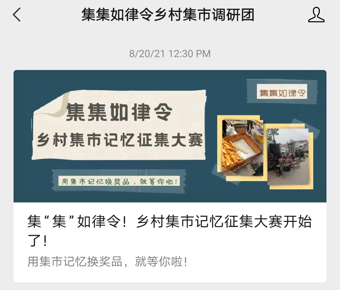 8月20日,调研团通过发布《集“集”如律令 乡村集市记忆征集大赛开始了》推文,标志本次社会实践活动进入调研实施阶段。在活动期间,调研团成员积极在各平台宣传本次活动,在群内为活动参与者答疑解惑。活动中,调研团收到来自山东、福建、广西等地的多份投稿,内容涵盖乡村集市的基本信息、乡村集市的历史与变迁、独特的集市文化、疫情下集市的变化、自己或者其他人在乡村集市的亲历亲见亲闻等。