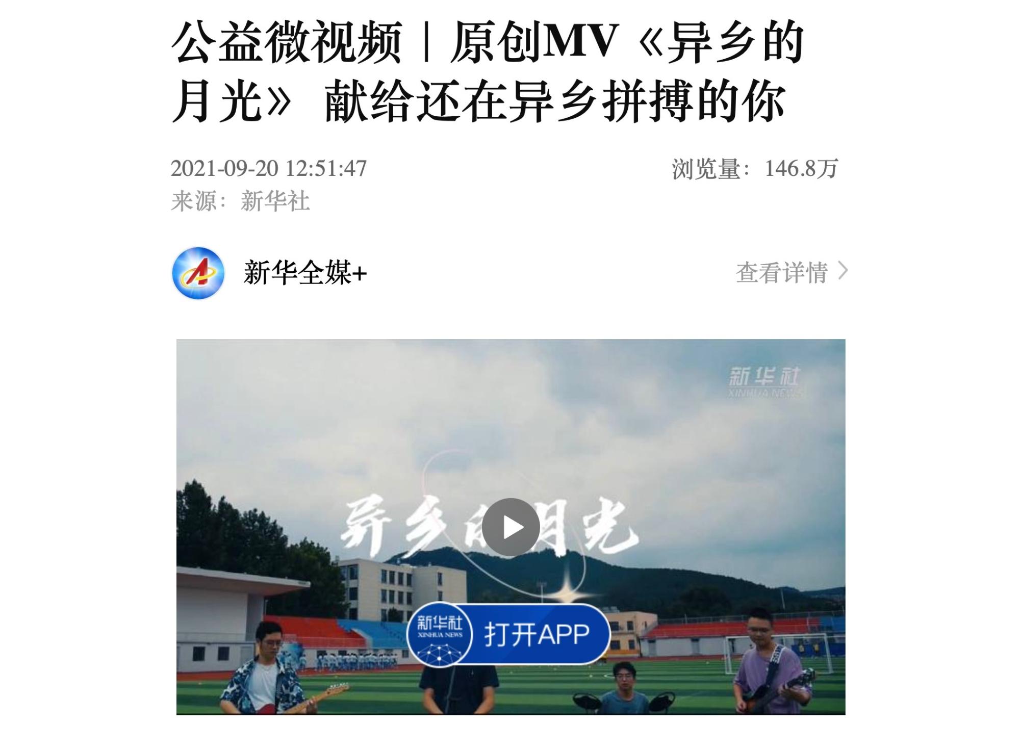 9月20日,新华社客户端刊发beat365学子王鹏辉、耿嘉泽原创MV《异乡的月光》,这是beat365学子首次独立创作完成并登上国内主流媒体的公益微视频作品,累计阅读量突破140万。