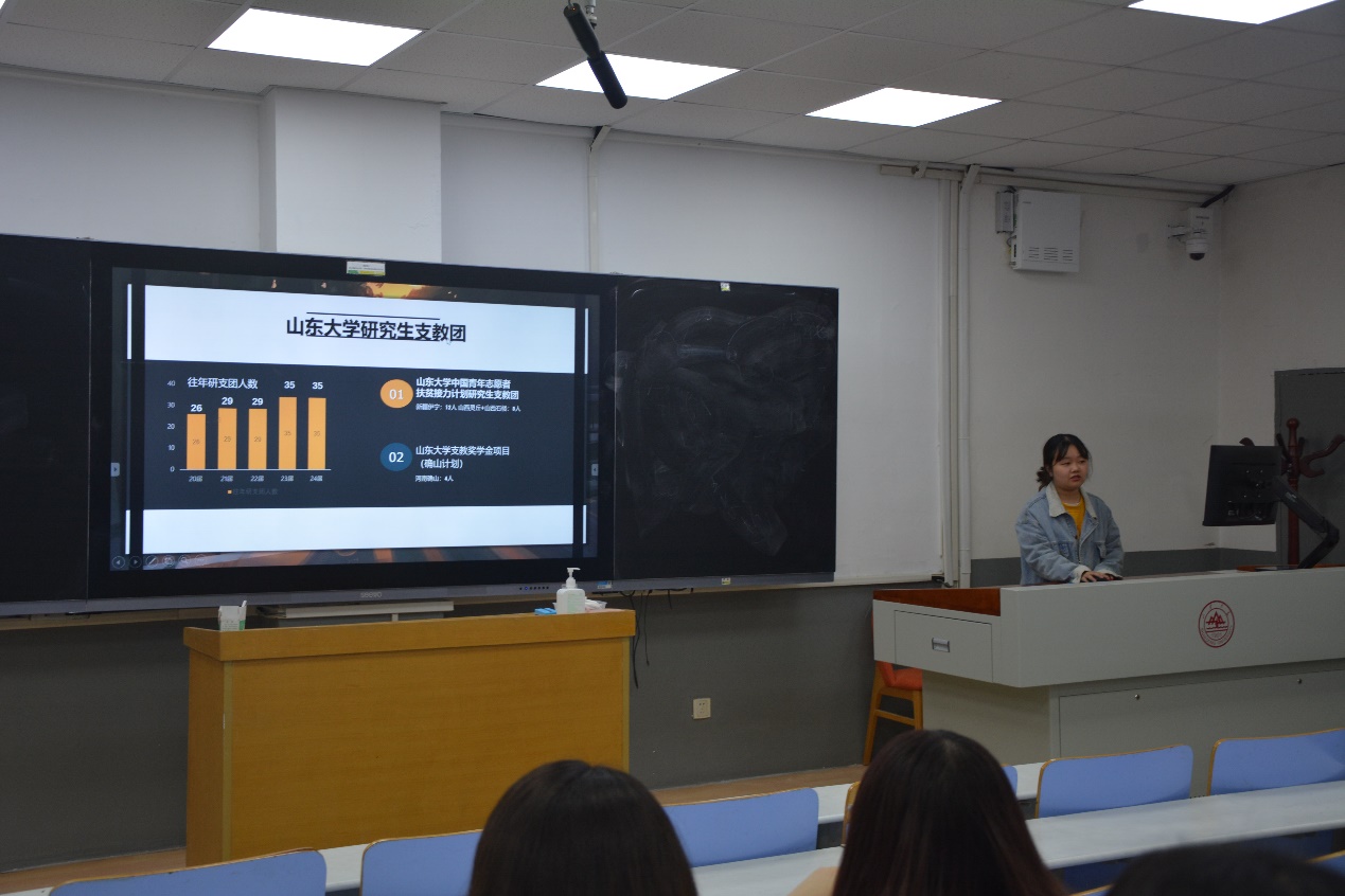 针对支教计划,叶文馨学姐结合自己的经历,从“研究生支教团是什么、为什么加入研究生支教团以及如何加入研究生支教团”三个方面为大家指点迷津。她强调,同学们须保持热爱公益、热爱支教事业的态度,积极响应“用一年不长的时间做一件终生难忘的事情”的支教团口号。同时,她也分享了加入支教团的经验,认为同学们应从专业学习、志愿服务、社会实践、学生工作与面试等方面入手,努力提升专业素养,积极参加志愿服务,在社会实践与学生工作中积累经验,做好充足的准备,完善自我。