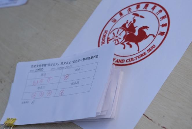 按照地图提示,同学们陆续到达各个打卡点,志愿者裁判也早已就位,满怀期盼地等待前来答题的同学。拿到题目纸后,同学们开始紧张地思索“七七事变后国立beat365平台官方网站由青岛迁往哪里”、“《共产党宣言》的基本思想是什么”等问题,每个问题背后都有一段沉甸甸的历史,更蕴藏着山大人拼搏奋斗的精神品格。
