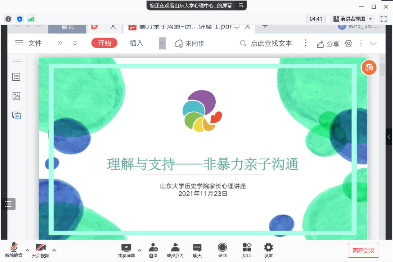 为加强家校联系,促进家校理解沟通,构建家校共育有效机制,11月23日晚,历史文化学院通过家校共育活动“同心课堂”平台面向全体学生家长召开家长会并举办第九期线上讲座“理解与支持——亲子关系中的非暴力沟通”。本次活动由副处级辅导员李一楠主持,讲座由心理健康教育与咨询中心孙笑澄老师担任主讲,学院全体辅导员、本硕博学生家长共同参会。