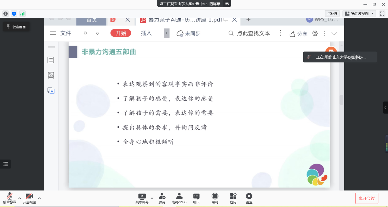 随后,孙笑澄通过对于学生进行心理咨询的部分类型分析,明晰了家长与学生良好沟通的重要性。她以案例为引,向家长们介绍了不同的沟通方式对孩子所造成的不同影响,指出“我们与孩子沟通的初衷都是爱,但有时候不注意沟通方式与带给孩子的感受,可能适得其反以致孩子无法理解到我们的爱和苦心”。她鼓励家长通过表达观察到的客观事实而非主观评价进与孩子进行非暴力沟通,了解孩子的感受、表达自己的感受,了解孩子的需要、表达自己的需要,从而在沟通中提出建议要求并得到正向反馈。同时,她还建议家长尊重并培养孩子的独立性,做到多询问、换位思考、理解孩子的特点和需求。在沟通中要做到平等对话、主动沟通,尊重、支持孩子的想法和行动,给予其正向引导,助力青年学生精神世界的完善。