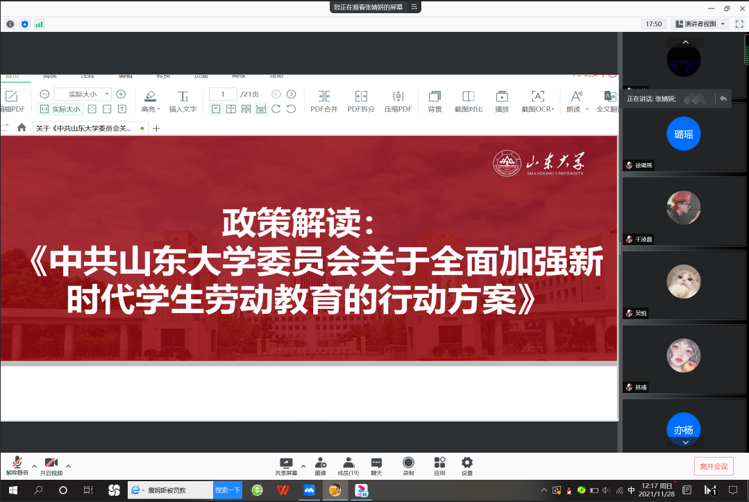 本次活动中,2020级档案学团支部聚焦文件解读、集体观影、组织研讨和展览参观四项活动内容,通过理论与实践的融合,切实学习与发扬劳动精神。12月2日,团支书张婧妍通过线上方式带领同学们集体学习《关于<中共beat365平台官方网站委员会关于全面加强新时代学生劳动教育的行动方案>的政策解读》,从制定背景、主要框架、面临问题与未来规划等方面深入研读文件内容,明确新时代全面加强劳动教育的重要意义。