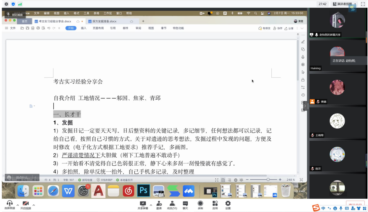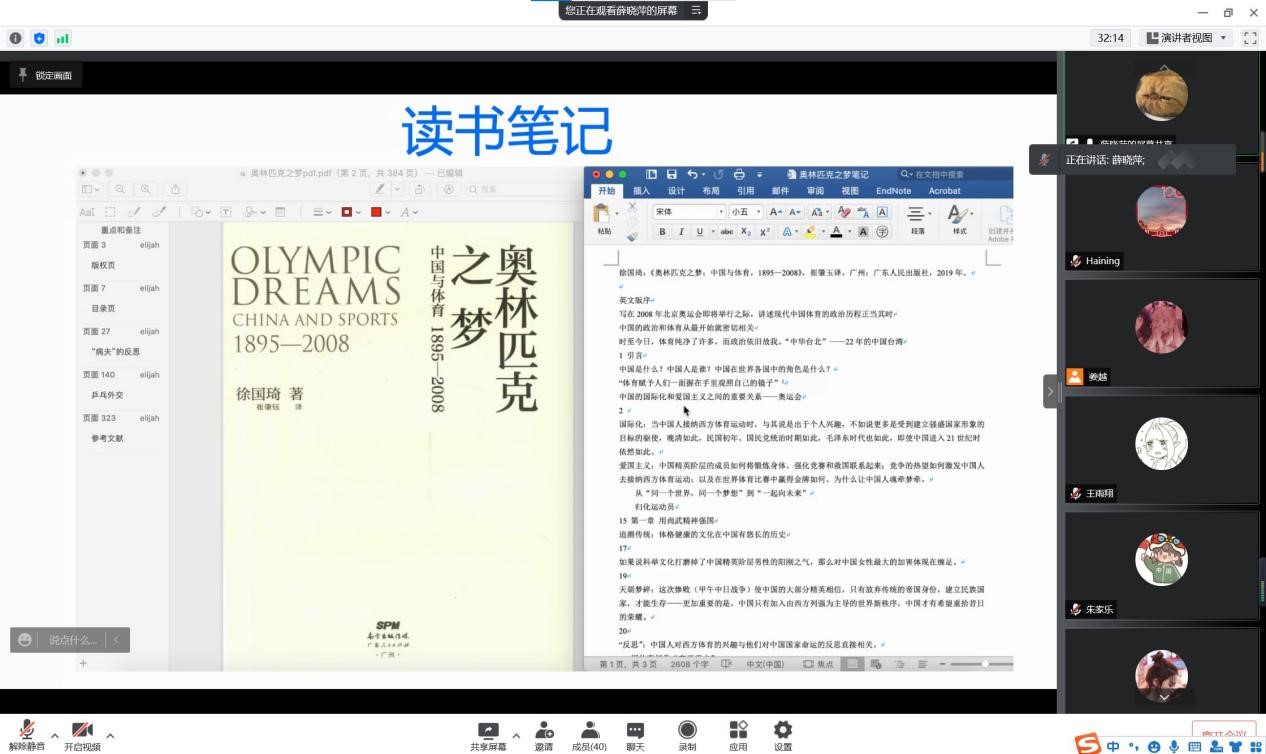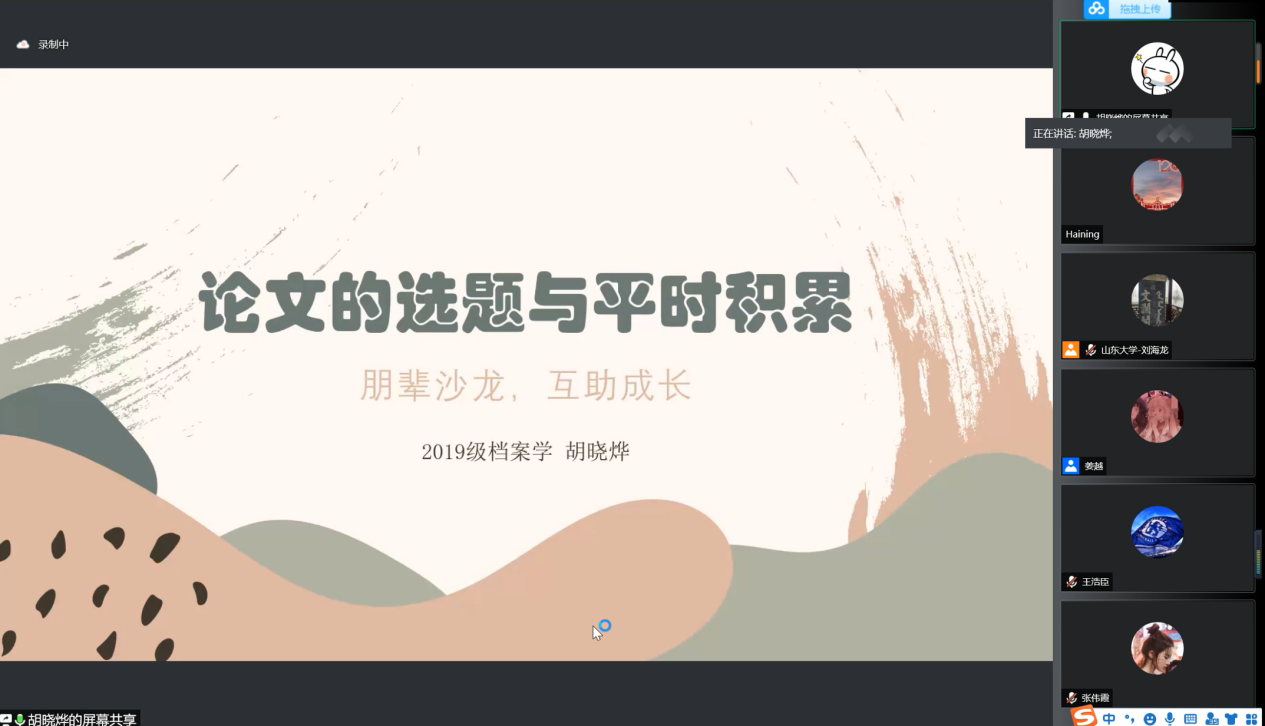 2月7日,就业(实习)经验分享会于线上举办,杨振杰、孙崇辕、赵怡然三名同学受邀分享,杨振杰、孙崇辕两位同学主要就岗位选择、简历制作、面试技巧等方面分享自身的实习或就业经验,考古学的赵怡然同学则充分结合自身的专业,介绍了探方发掘需要做的准备以及在实际实践过程中的注意事项。2月11日,刘海龙、孙辰睿、胡晓烨三名同学受邀分享论文撰写心得,三位同学主要就如何选题、如何获取材料、如何搭建论文逻辑框架等问题进行分享,此外,他们也分享了自己在论文撰写过程中遇到的问题,以及自己的论文写作技巧等内容。2月14日,读书分享会线上举行,王雨翔、高妍、薛晓萍三名同学受邀进行分享,王雨翔和高妍同学主要介绍了自己如何进行书籍的选择以及读书的方法,其中,高妍同学强调了读书环境对于自身的影响,也为同学们如何提高读书效率提出了建议,薛晓萍同学则充分结合了其当下正在阅读的书籍以及读书笔记,向大家介绍了其撰写读书笔记的方法并分享了其阅读过程中的心得体会。2月18日,董欣怡、毕欣雨、伊楠三名同学受邀主讲学生干部经验分享会,三位同学主要分享了自己的学生工作经验和工作中遇到的各种问题,同时,她们也就学生工作中容易出现的各种问题进行了方法建议。