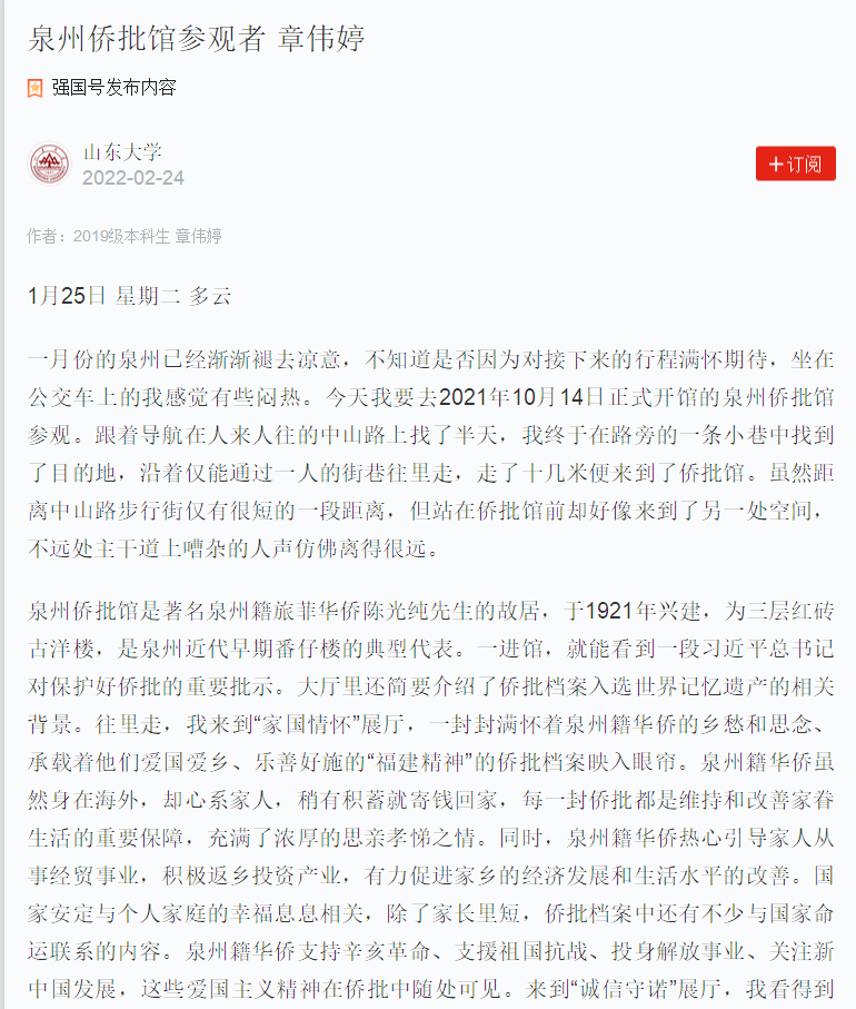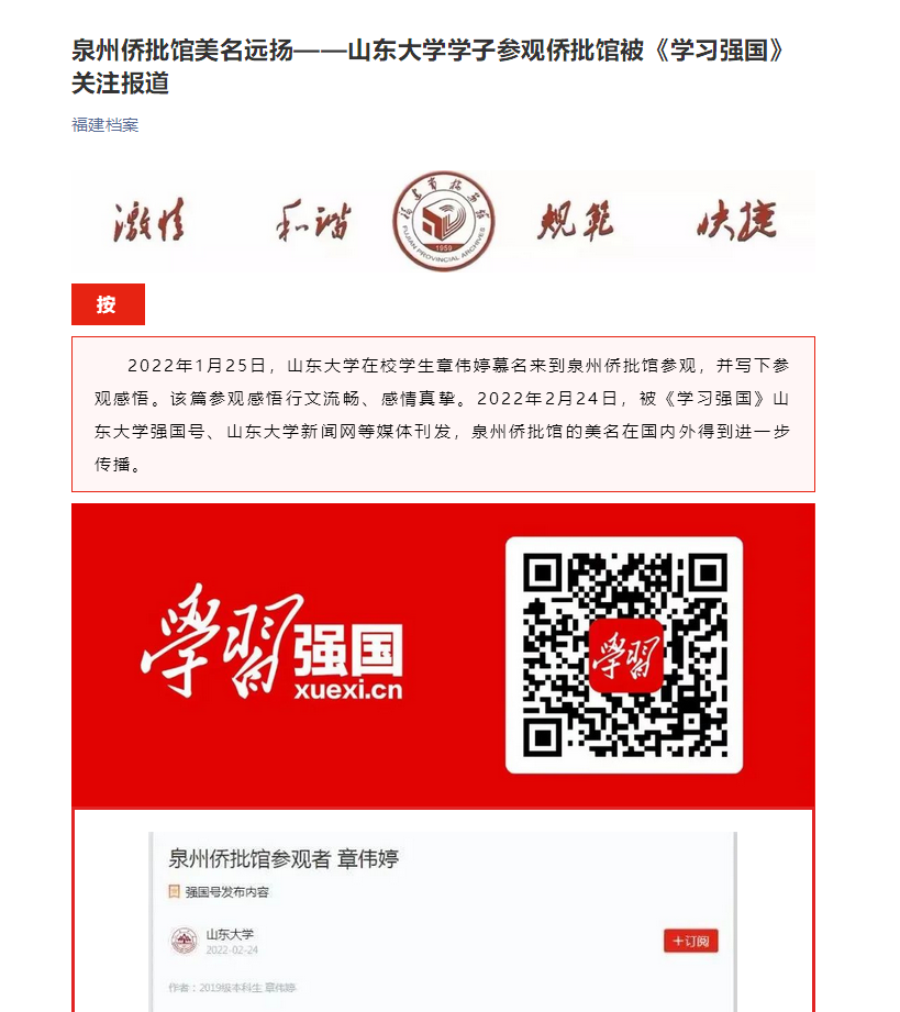 2月24日,“学习强国”beat365平台官方网站强国号刊发2019级档案系本科生章伟婷的文章。3月9日,福建省档案馆官方微信公众号“福建档案”发表了名为“泉州侨批馆美名远扬——beat365平台官方网站学子参观侨批馆被《学习强国》关注报道”的文章,对章伟婷的文章内容给予高度评价。