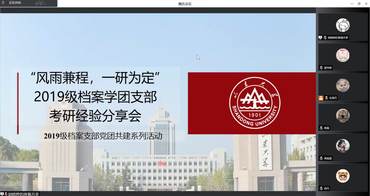 结合档案学专业特色和班级实际,帮助学生更好地了解、准备考研相关事项,近日,2019级档案学团支部线上举办党团共建系列活动之“风雨兼程,一研为定”考研经验分享会,学生徐晴暄、李蕊受邀分享,2019级档案班班主任霍艳芳参加活动。活动由档案学团支部书记胡晓烨主持。