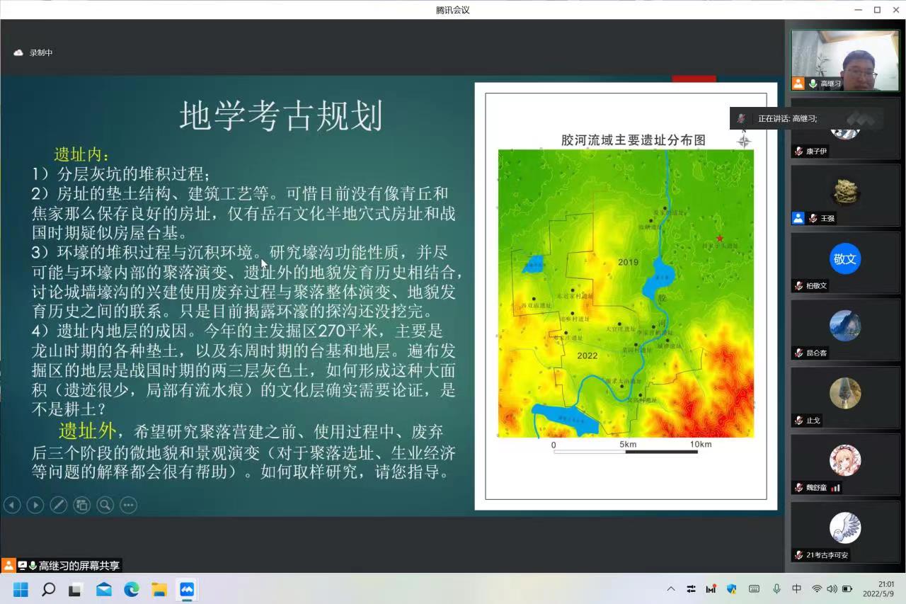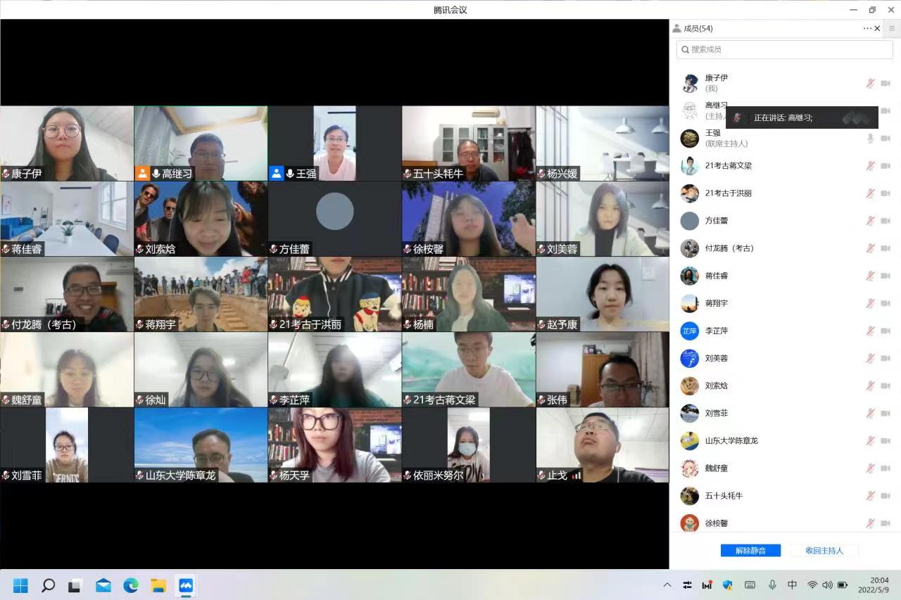 在详细讲解了考古发掘的准备工作之后,高继习又详细介绍了前冢子头遗址的发掘收获,如东周时期建筑台基和动物骨骼、岳石文化灰沟以及陶片等,为同学们展示了如何有效解读发掘资料。教师王强、唐仲明、付龙腾、武昊就遗址相关问题分别发言,与同学们进行了亲切交流。活动最后,考古教工党支部书记王强进行了总结,他首先对高老师在繁重的发掘工作之余,给大家带来精彩的讲解表示感谢。他指出,师生党团共建活动,是疫情形势下一种很好的师生交流形式,希望疫情尽快好转,师生们能够共赴发掘工地,开展现场交流活动。