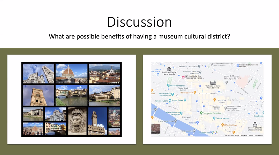 《文化场馆与文化区管理》课程旨在使学生对文化场馆及文化区有基本理解,并鼓励学生参观和深入了解各类文化场馆、各类文化活动。课程分为四个部分,包括文化场馆及文化区的概念、价值、管理及节目策划,同时老师也在课堂中阐释了有关文化场馆的学术观点,展示和讲解了很多文化场馆的特色及其文化活动。课程按照每两节课一个板块,每个板块结束时提供10-15分钟的自由讨论时间,如在文化场馆及文化区的概念这一部分的讨论围绕着设立博物馆型文化区可能会带来的益处进行。