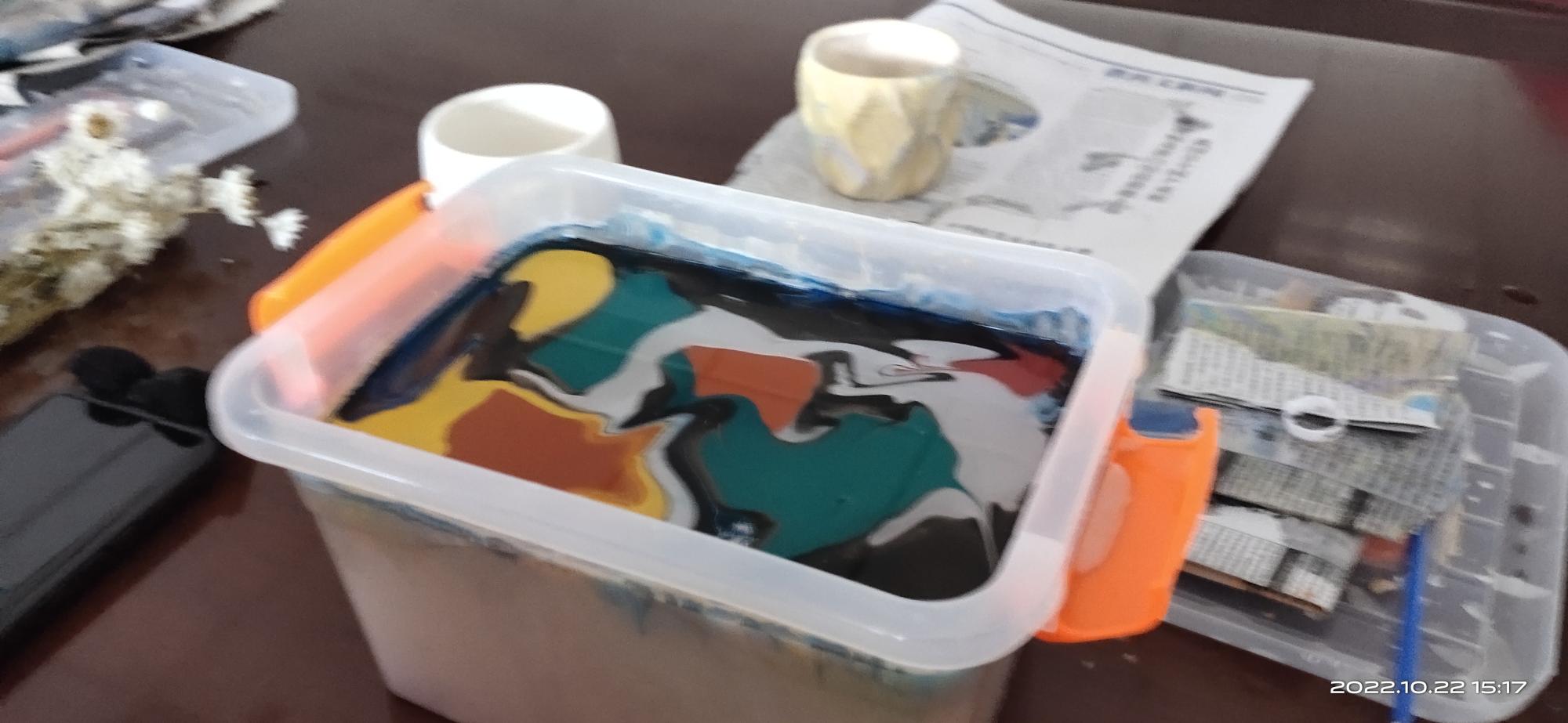 大家的配色都十分新奇有趣,比如黑红搭配出的高级感、红黄绿搭配出的“敦煌色”,粉紫白搭配出的梦幻色、绿黄营造的“小清新”,不一而足,异彩纷呈。将素胚陶盆浸入画液拓印的过程中,也充斥着不少“翻车”现场和笑声。