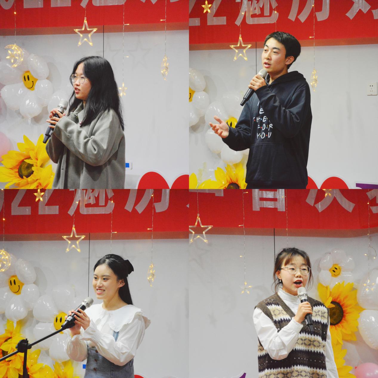 决赛正式开始前,由樊华同学领队携手2022届新生带来的开场舞《奔跑的青春》,展现了青春的活力,现场气氛也热烈起来。紧接着,第一组选手登台演出。于凌晨带来曲目《十年》,为大家讲述了温柔缱绻却又难掩落寞的细腻情感;刘索焓带来的曲目《喜欢你》,表达了两个人之间温柔的爱意;方译旋的《忘记拥抱》,挥挥手告别过去,拥抱未来的阳光;刘子煜带来的《光阴的故事》,老歌回味无穷,青春肆意开朗。歌声动听,情感真挚,赢得了观众们热烈的掌声。随后2021级研究生姜艺同学的改编古筝曲《仙儿》,为大家带来了一场摇滚与古典的碰撞的艺术盛宴。