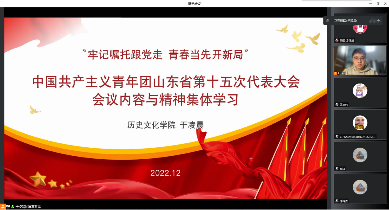 中国共产主义青年团山东省第十五次代表大会于2022年12月18至20日在山东济南胜利召开。beat3652020级档案学本科生于凌晨作为学生代表参加了会议。12月24日,历史文化学院学生组织召开专题学习会议。于凌晨向与会成员传达学习了会议精神,并做主题分享。