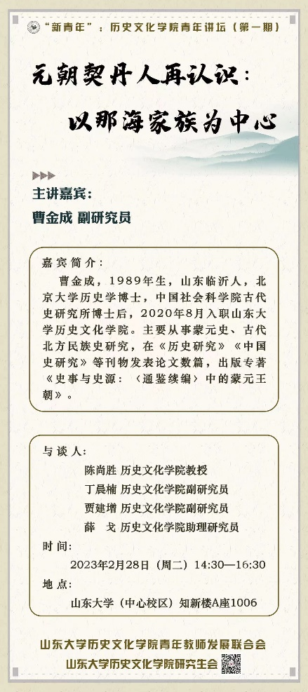 2月28日,“新青年:历史文化学院青年讲坛”第一期报告会举行。中国古代史教研室曹金成副研究员作题为“元朝契丹人再认识:以那海家族为中心”的报告。报告会由陈尚胜教授担任点评人,青年教师丁晨楠、贾建增、薛戈担任与谈人。历史文化学院副院长代国玺、党委副书记张伟参加报告会,报告会由孔勇副教授主持。